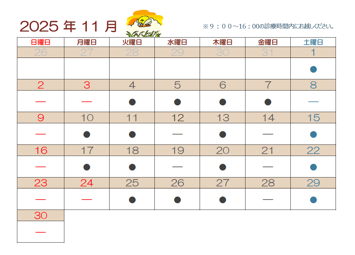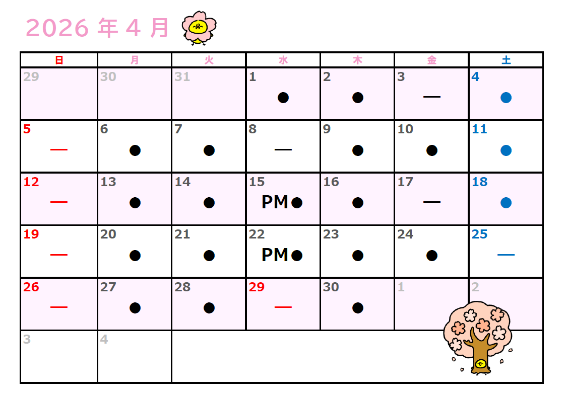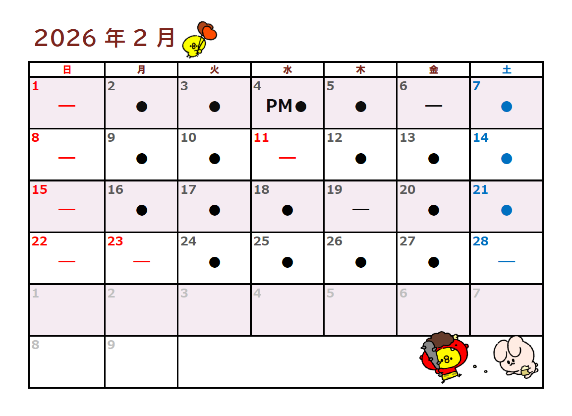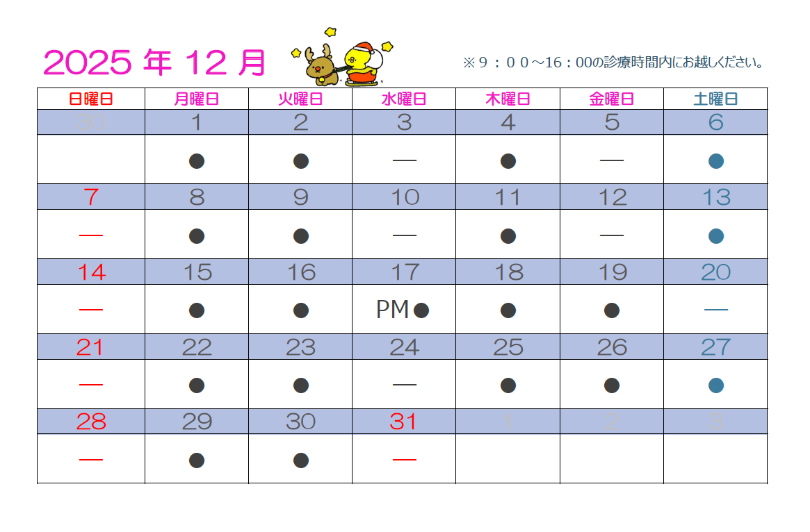 ※【ー】は検査技師休みです。【●】の日にご来院ください※