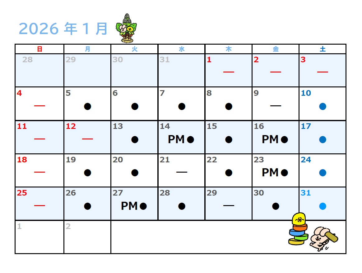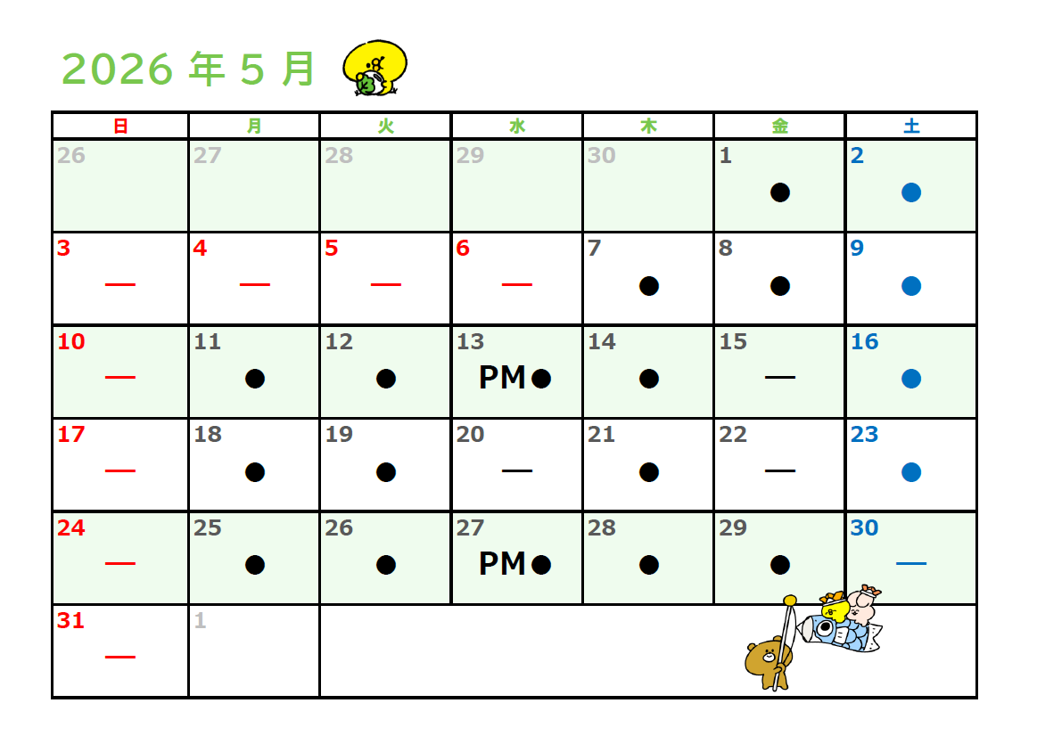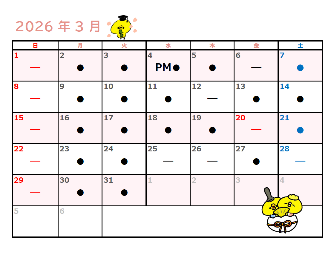 ※【ー】は検査技師休みです。【●】の日にご来院ください※
